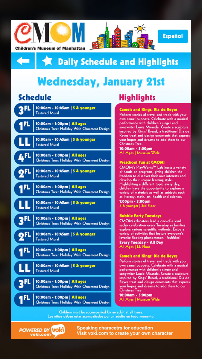 Role: Conceptualized and lead design on a kiosk for The Children's Museum of Manhattan's lobby that guides visitors on their current attractions and exhibits.