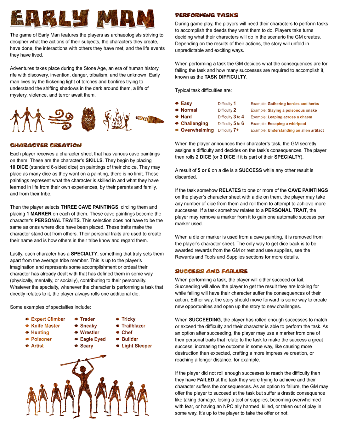 Designed and illustrated an innovative pen and paper role playing game set against the backdrop of the Stone Age. The game features players as "archaeologists" striving to decipher what the actions of their subjects, the characters they create, have done, the interactions with others they have had, and the life events they have lived by interpreting cave paintings.