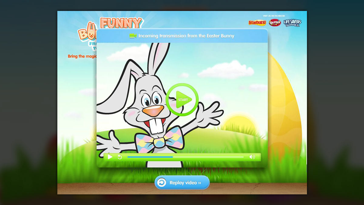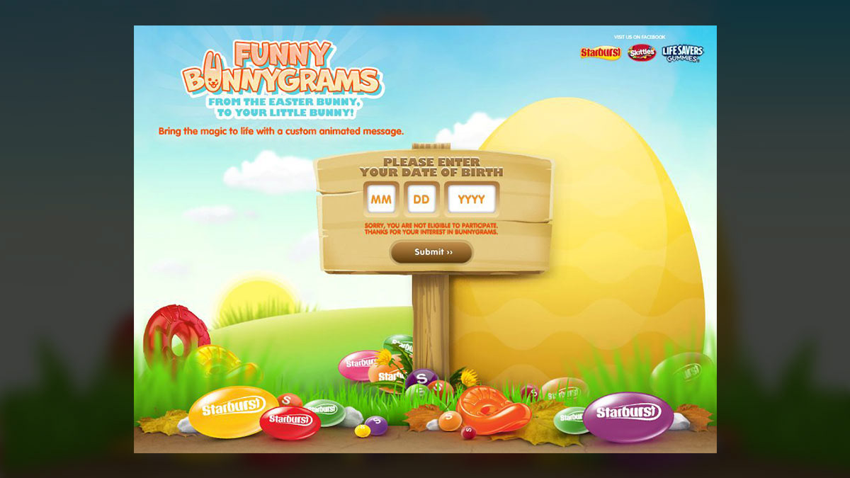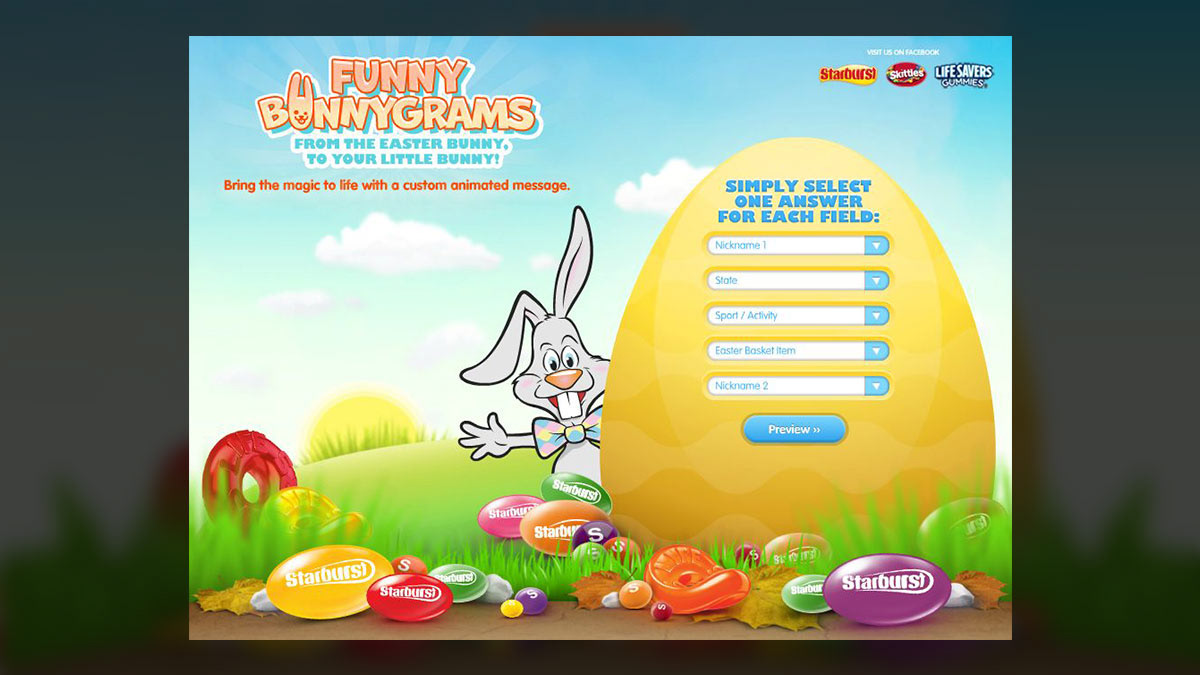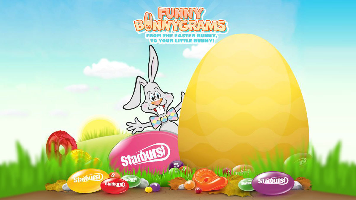 Wrigley's Funny Bunnygrams features a user's uploaded name and a custom message from a wacky Easter Bunny amongst delicious candy.