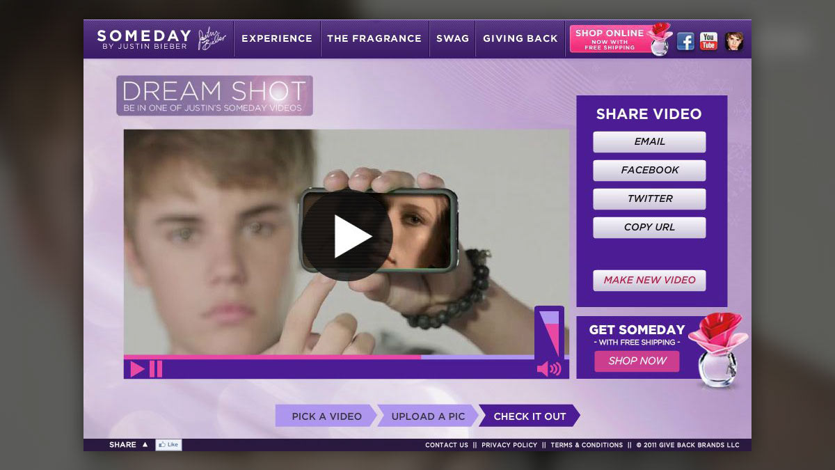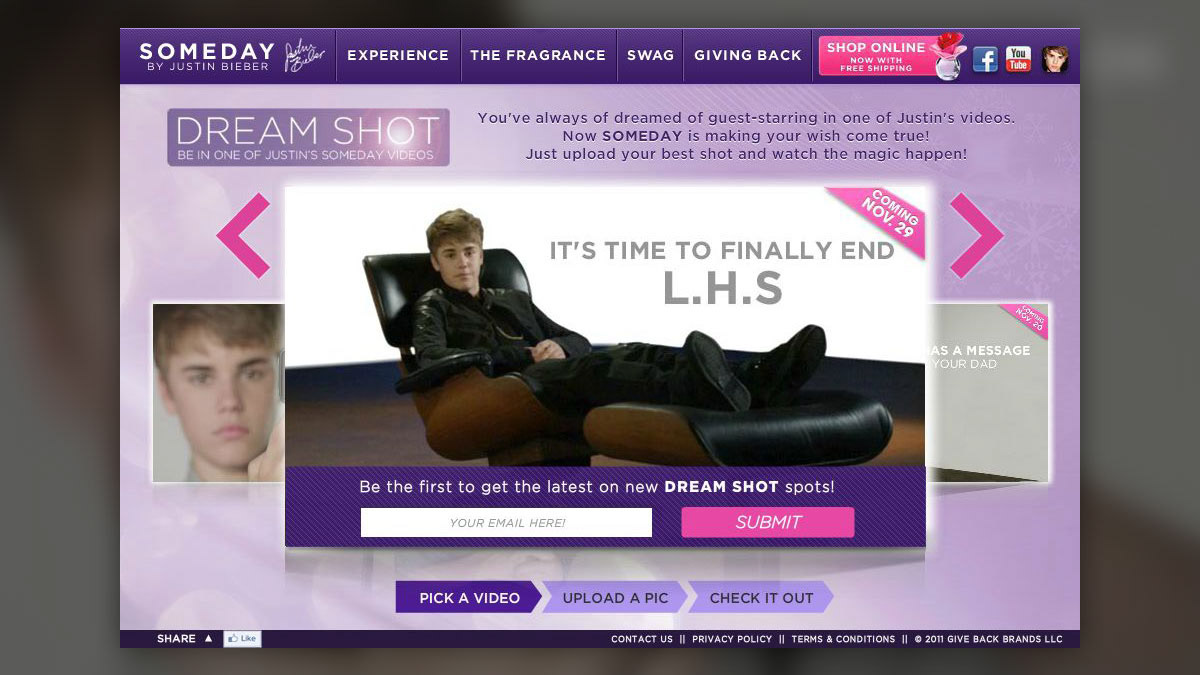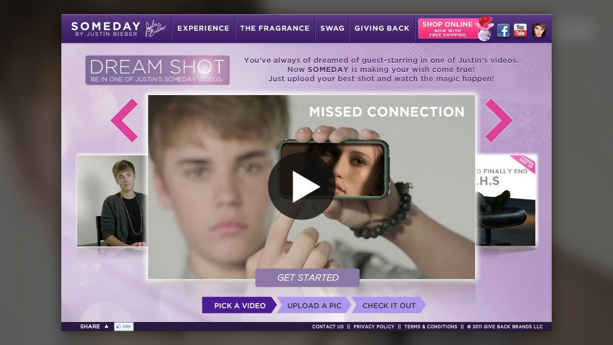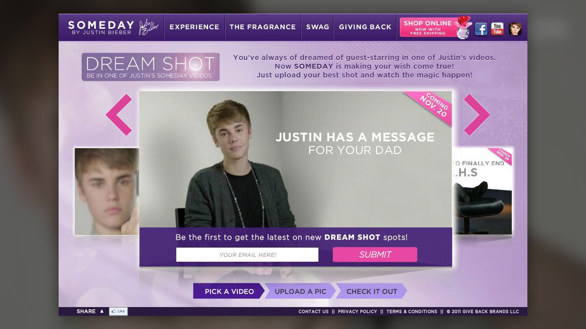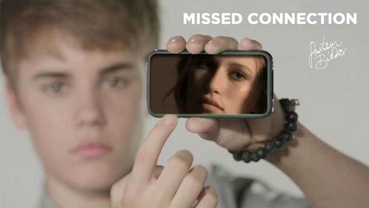 Promoting his new fragrance line, Justin Beiber's Missed Connection app features a user's photo in a sexy message to you or your father from Justin himself.